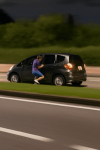 De meeste mensen zouden op zo’n moment verstijven of de auto laten staan om erger te voorkomen. Maar deze bestuurder dacht daar anders over. In een reflex trapte hij het gaspedaal in, vermoedelijk uit schrik of pure adrenaline. De auto schoot vooruit, terwijl de dief nog half aan de deur hing. Wat een snelle buit had moeten worden, veranderde in een pijnlijke les over verkeerde keuzes.