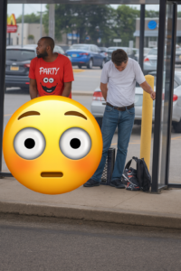 En dan is er nóg een element dat de video onderscheidt van de meeste opmerkelijke filmpjes die het internet rondgaan. Want ergens in het beeld staat ook iemand met een stompje, die zich ogenschijnlijk óók midden in deze bijzondere situatie bevindt zonder er actief aan deel te nemen. Het is bijna alsof dit bushokje voor even een kruispunt werd van drie totaal verschillende levens, emoties en staat-van-zijn-momenten. Ieder op zijn eigen manier aanwezig, ieder met een totaal andere energie.