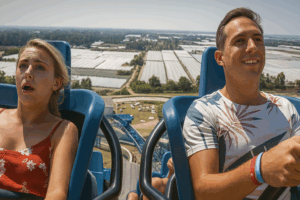 Er zijn van die momenten waarop je achteraf denkt: “Was dit wel zo’n goed idee?” Dat gevoel moet dit vrolijke koppel hebben gehad nadat ze instapten in een van de snelste achtbanen van het pretpark – gekleed in outfits die achteraf misschien toch niet helemaal geschikt waren voor een ritje vol snelheid, scherpe bochten en zwaartekracht-tartende afdalingen. Het gevolg? Beelden die inmiddels viraal gaan en voor een grote glimlach zorgen bij iedereen die ze bekijkt.