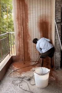 Aan het begin van de beelden lijkt alles nog rustig. De man staat stevig voor de muur en heeft de machine in twee handen. Het oogt alsof hij vaker met dit soort apparaten heeft gewerkt, want zijn houding is in eerste instantie redelijk zelfverzekerd. Toch kun je, als je goed kijkt, al zien dat de hoek waarin hij de machine vasthoudt niet ideaal is. Hij staat iets te dicht op de muur, zijn armen zijn niet volledig gestrekt en de kracht van het apparaat lijkt hij te onderschatten. Dat is een combinatie die vaker leidt tot situaties waarin je meer moet corrigeren dan je lief is.